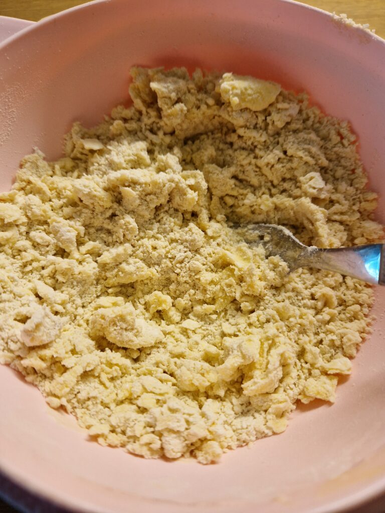 Nypi rasva ja jauhot murumaiseksi seokseksi. Jos olet malttanut sulattaa rasvan huoneenlämmössä todella pehmeäksi, tämä onnistuu helposti ihan haarukalla hämmentämällä.