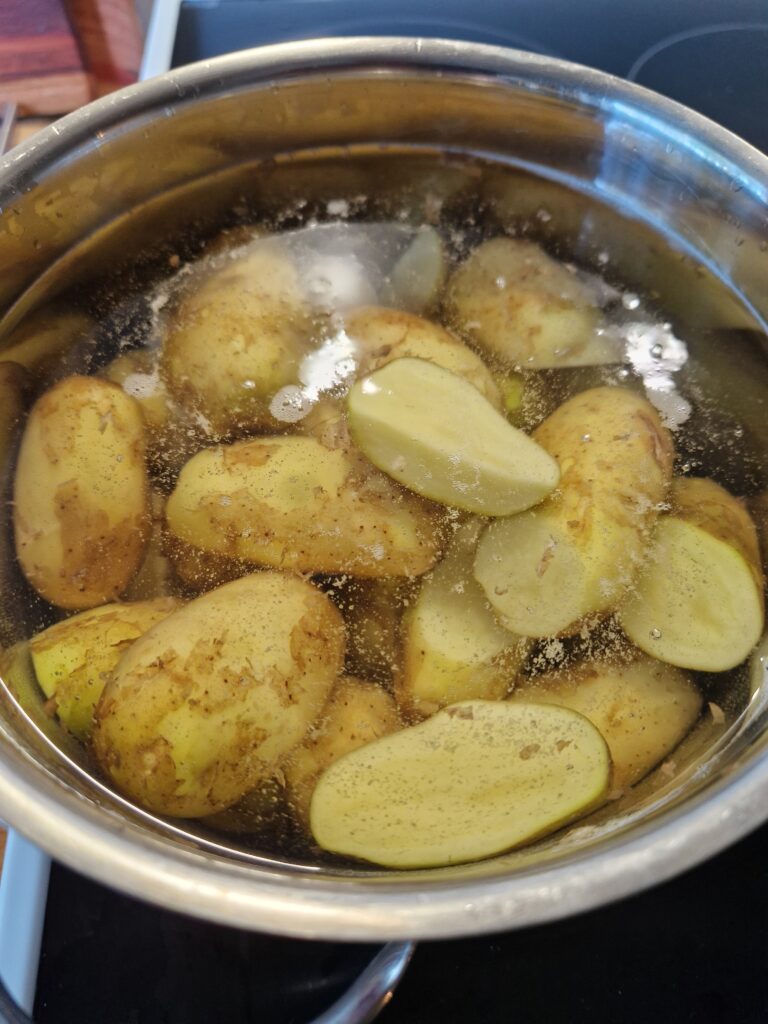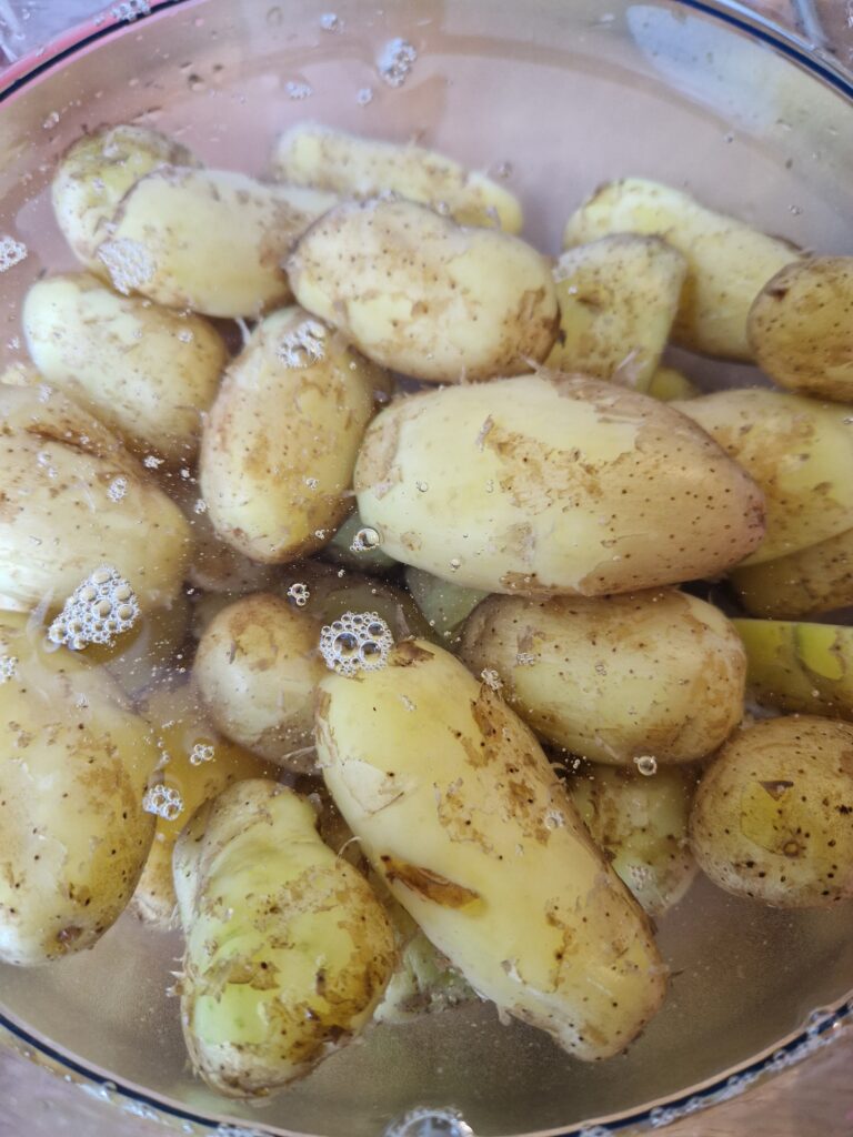 Perunat pestynä ja harjattuna juuresharjalla. Laita vesi (lisää hieman suolaa) kiehumaan.