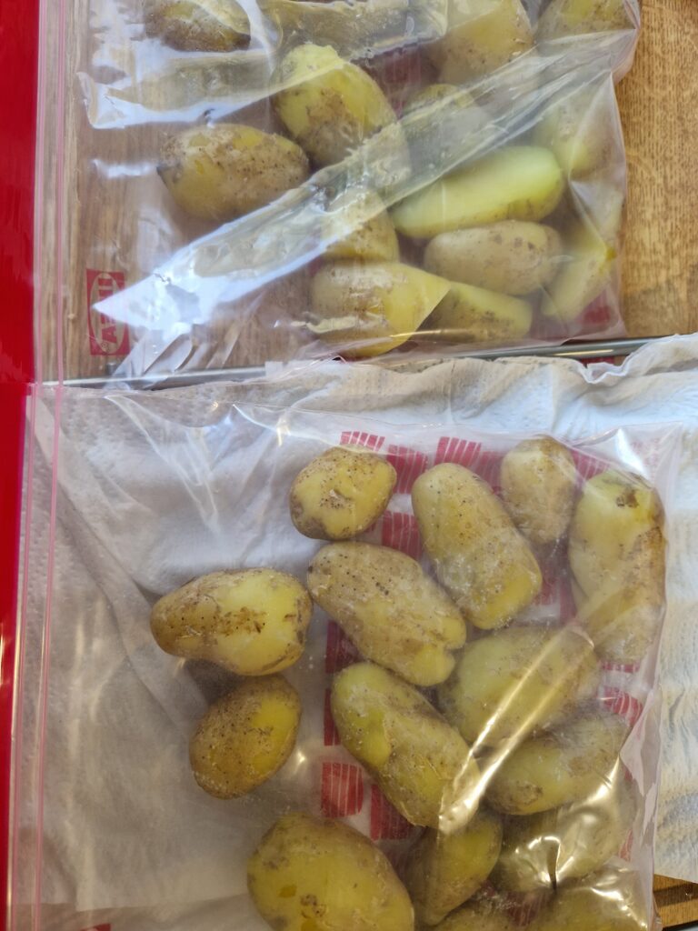 Laita perunat pakastimeen. Kun haluat käyttää niitä, lisää jäiset perunat kiehuvaan veteen ja keitä kypsiksi ihan normaalisti. Ovat kerrassaan herkullisia talven keskellä kun kesä on muisto vain ja seuraavaan on sata vuotta aikaa.